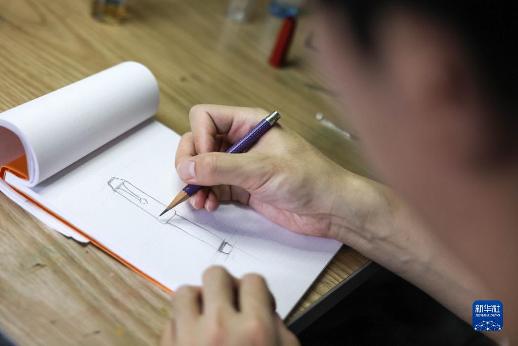 7月1日,袁建在位于貴州大學(xué)國家大學(xué)科技園的工作室繪制設(shè)計草圖。