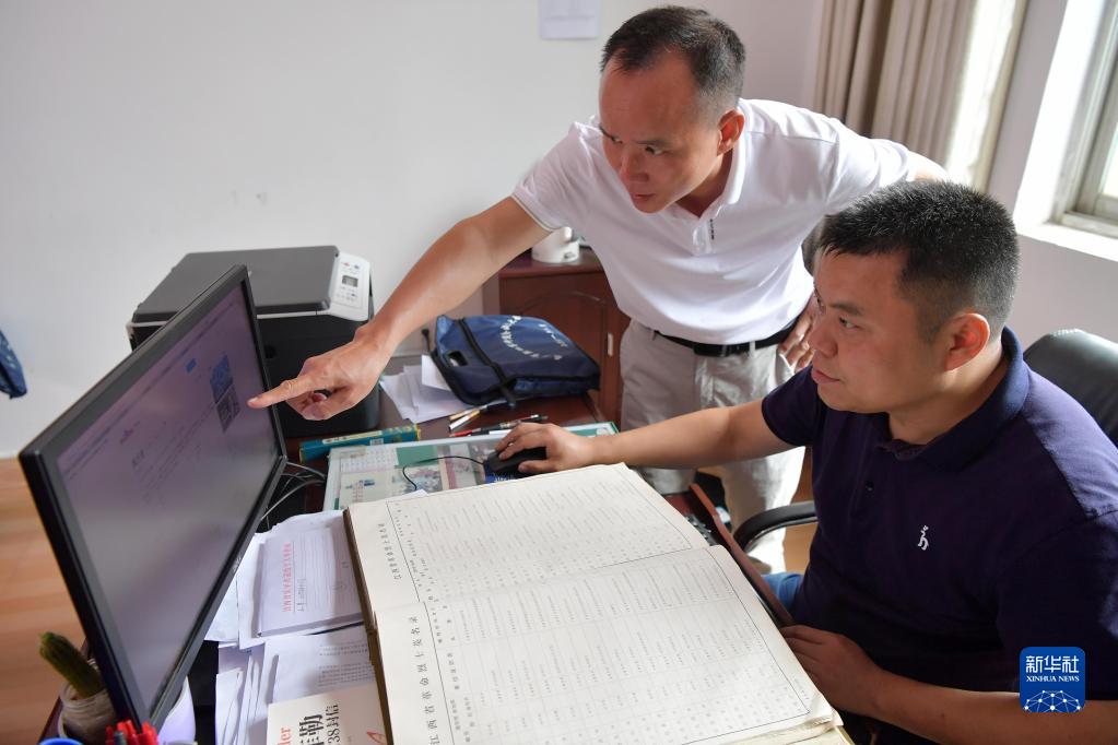 在江西省樂平市退役軍人事務(wù)局,程雪清(左)在工作人員幫助下上網(wǎng)查找烈士資料(7月6日攝)。