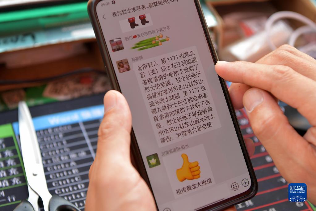 成功為烈士尋親后,程雪清都會在各個烈士尋親群進行公告,為的是讓更多人加入這支隊伍中。如今,在他的影響下,即將大學畢業的兒子也加入進來,一些大學的青年志愿組織主動聯系程雪清希望參加為烈士尋親工作。