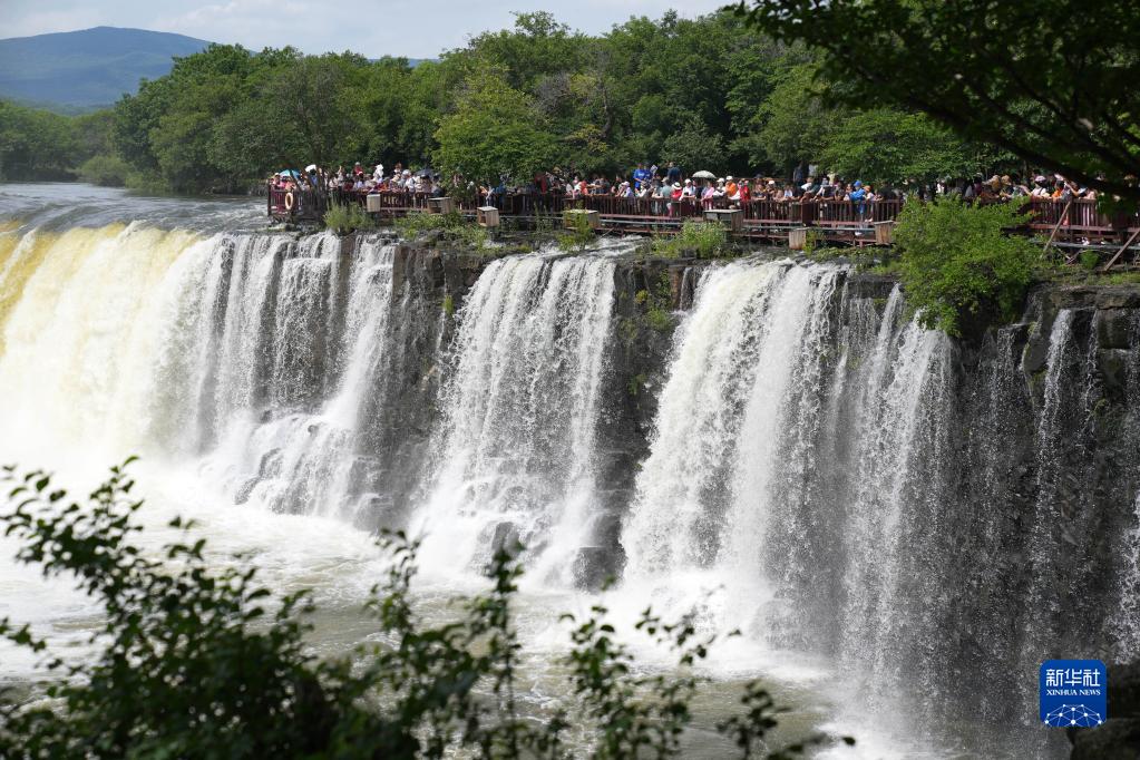 受上游來水量增多等因素影響,近日,位于黑龍江省牡丹江市的鏡泊湖世界地質公園水量持續增加,景區內的吊水樓瀑布出現“三面溢流”壯觀景象。