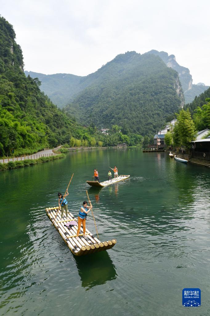 7月16日,游客在湖北省宜昌市秭歸縣三峽竹海生態(tài)景區(qū)體驗(yàn)竹筏親水項(xiàng)目。
