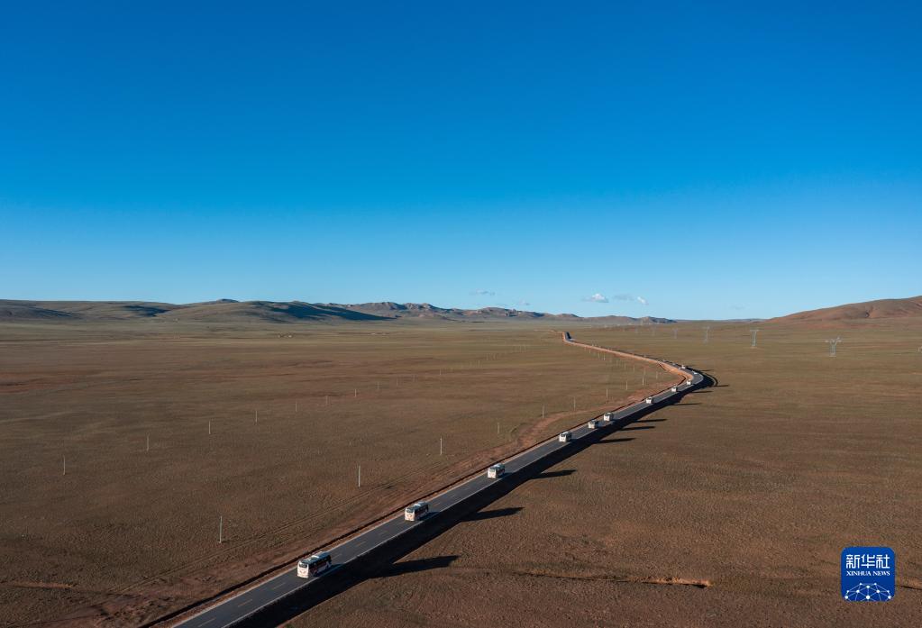 從雙湖縣出發的車隊行駛在前往森布日安置點的道路上(7月19日攝,無人機照片)。