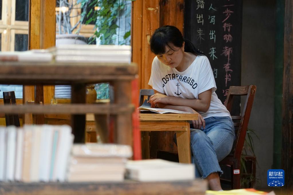 一名游客在留壩縣城老街上的一家書屋內讀書(2020年9月3日攝)。