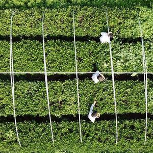 8月3日,在山東省泰安市岱岳區(qū)道朗鎮(zhèn),茶農(nóng)采摘夏茶(無人機(jī)照片)。