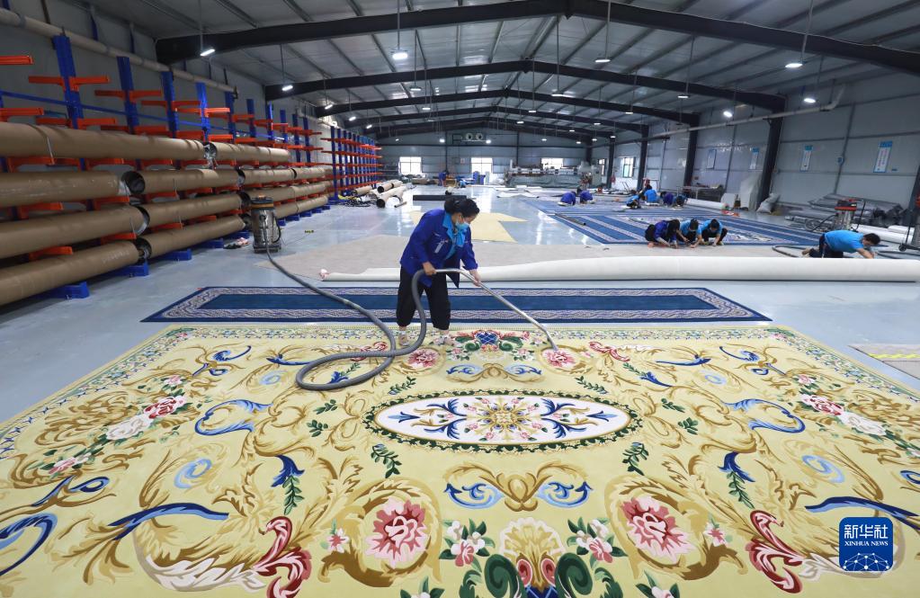 8月17日,工人在河北省石家莊市行唐縣一家外貿地毯生產企業清理地毯產品。