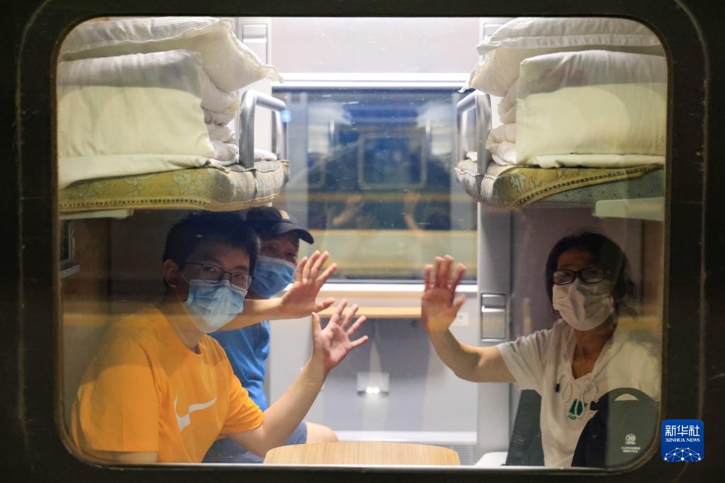在南昌火車站,劉熙鴻和家人在前往北京的火車上向窗外揮手告別(8月15日攝)。