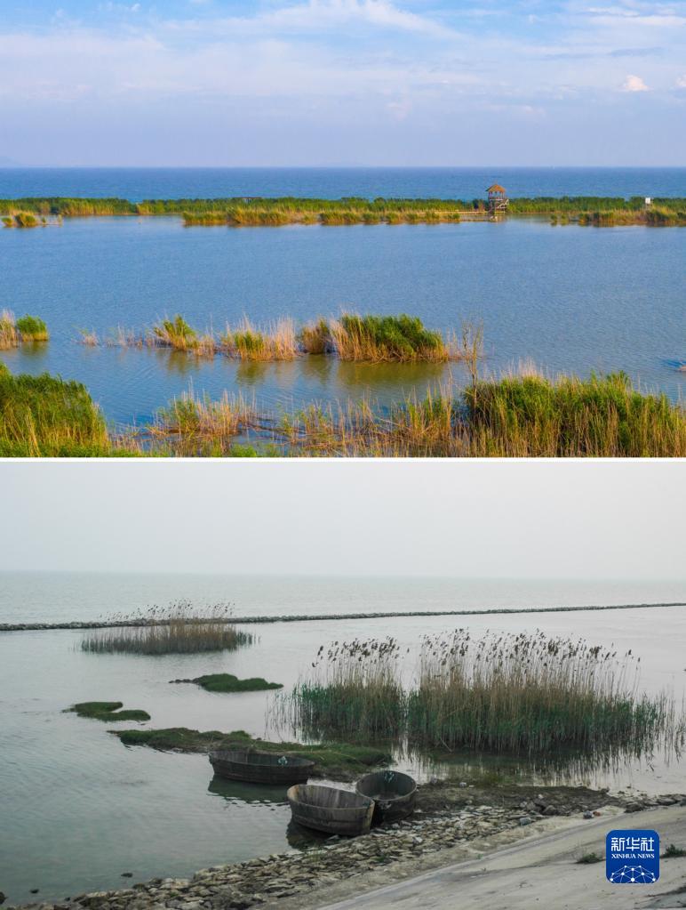 這是一張拼版照片:上圖為2021年7月9日拍攝的位于合肥市包河區(qū)的巢湖湖濱濕地風(fēng)景(葉玉庭攝);下圖為2008年4月7日拍攝的巢湖景象(何希斌攝)。