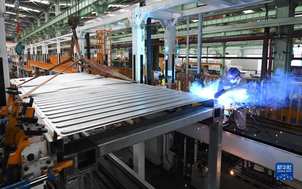 工人在智能化鋼結(jié)構(gòu)模塊化生產(chǎn)線的總裝線上進行焊接作業(yè)(2022年9月28日攝)。