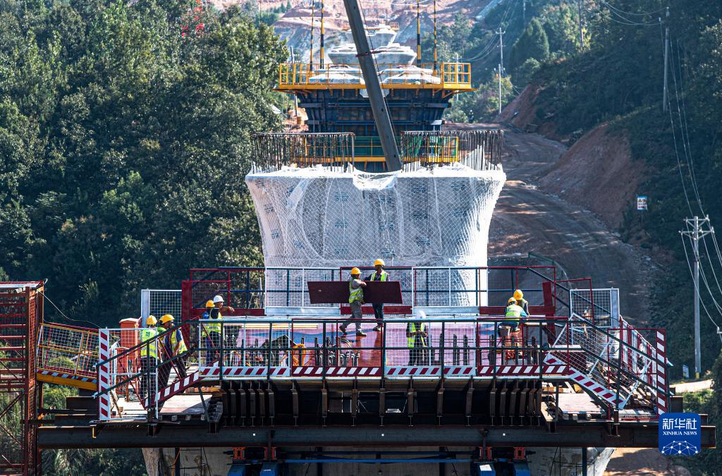 10月2日,中鐵七局工人在滬渝蓉高鐵武宜段龍泉河特大橋施工現場作業。
