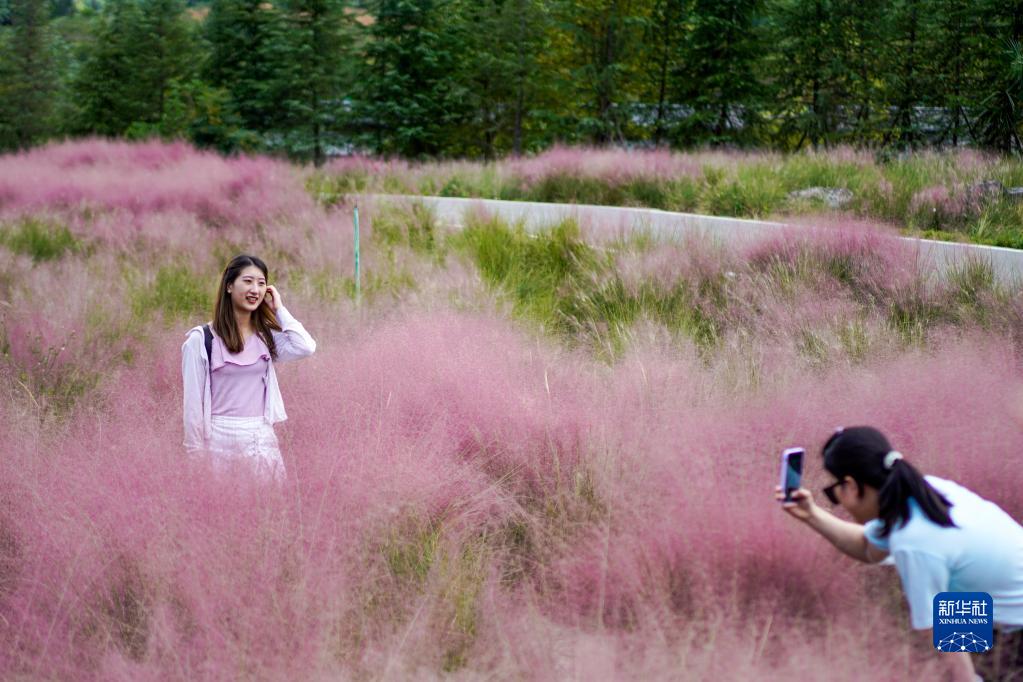 10月2日,游客在疊石花谷景區(qū)內(nèi)粉黛亂子草組成的粉色花海中拍照留念。