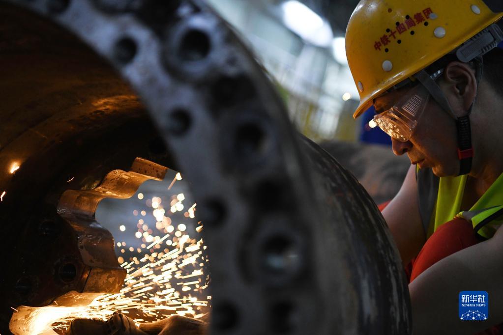 10月3日,工作人員在蕪湖城南過江隧道施工現場打磨刀桶。