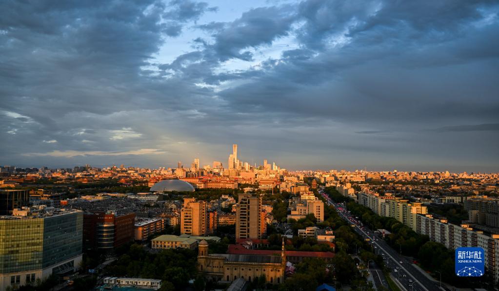 10月3日,夕陽照亮北京CBD的高樓建筑群。據(jù)天氣預(yù)報顯示,北京當(dāng)天冷空氣影響逐漸顯現(xiàn),陣風(fēng)可達(dá)七級左右,夜間最低氣溫預(yù)計將降至8℃。