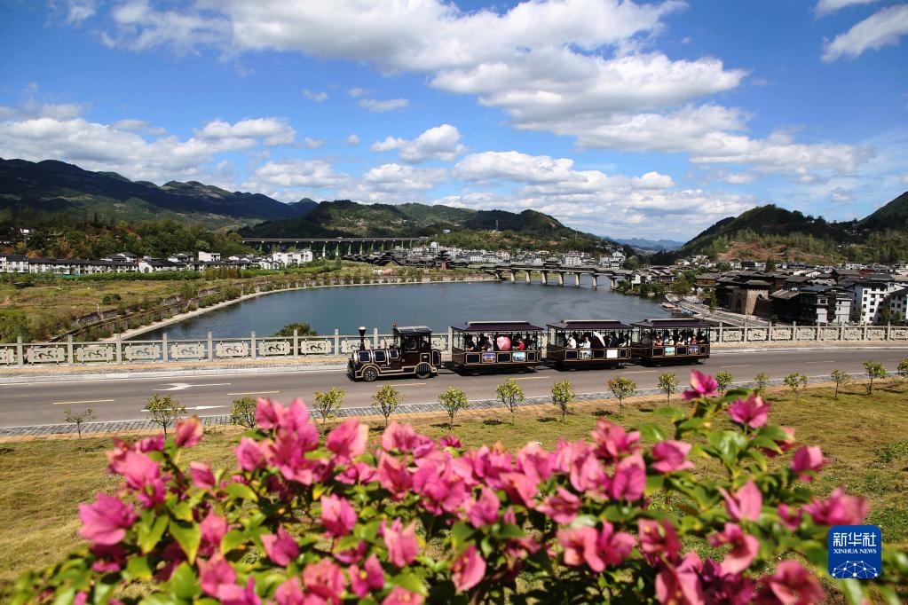10月3日,游客在重慶市黔江區濯水景區乘坐“小火車”游玩。