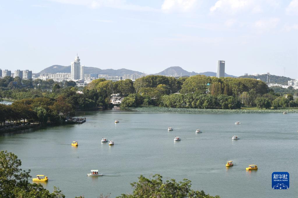 10月3日,游客在南京玄武湖公園劃船游玩。