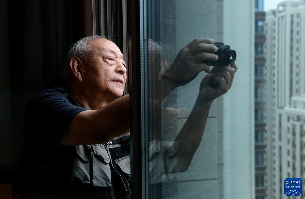 10月3日,77歲的王汝春在河北省石家莊市裕華區(qū)家中陽臺拍攝“天空圖片”。從2014年開始,王汝春一直堅持每天在家中固定記錄天氣變化,已經(jīng)拍攝了三千多張“天空圖片”,被譽為“天空攝影師”。