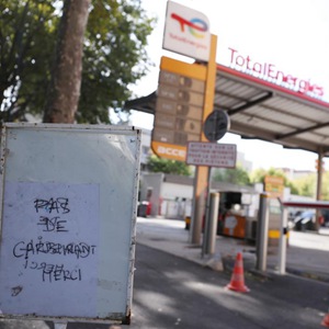10月4日,在法國巴黎附近的克里希市,一處道達爾加油站前擺出“沒有油了,謝謝”的公告牌。