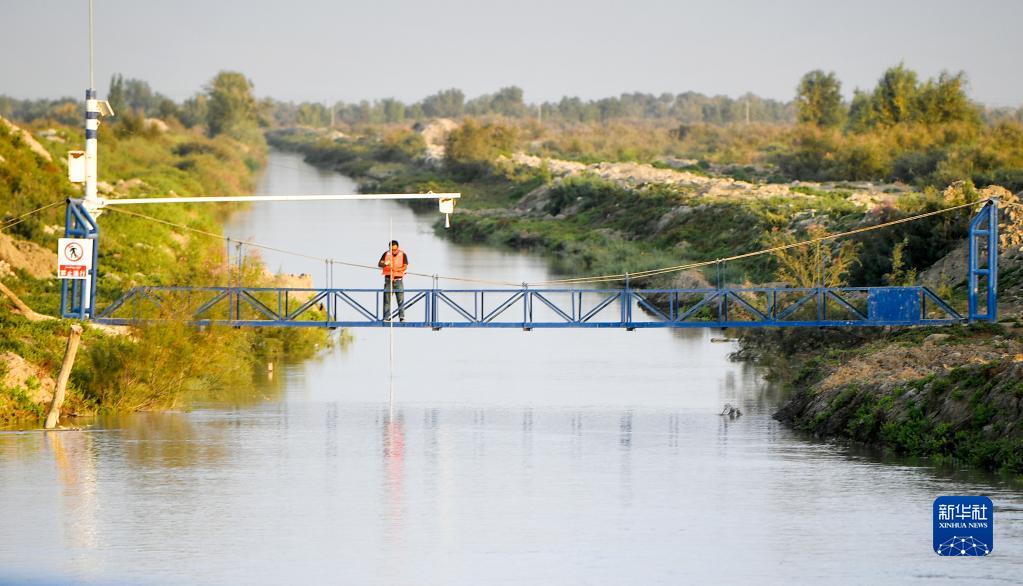 工作人員在新疆阿克蘇地區(qū)沙雅縣沙德克確了生態(tài)閘旁收集水文數(shù)據(jù)(2022年8月13日攝)。