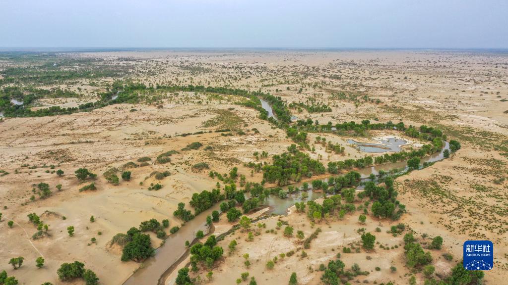 這是2022年6月20日拍攝的新疆尉犁縣墩闊坦鄉(xiāng)托布協(xié)區(qū)域,生態(tài)輸水滋養(yǎng)了植被(無人機(jī)照片)。