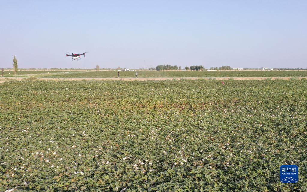 在新疆尉犁縣興平鎮達西村一處高標準農田,種植戶用無人機噴灑脫葉劑(2022年9月20日攝,無人機照片)。