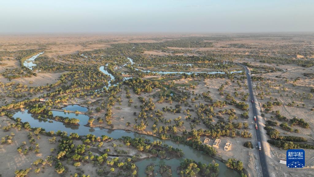 這是2022年8月18日拍攝的塔里木河下游阿拉干斷面景象(無人機(jī)照片)。生態(tài)水滋潤兩岸胡楊等植被,同時保障交通要道少受風(fēng)沙侵襲。