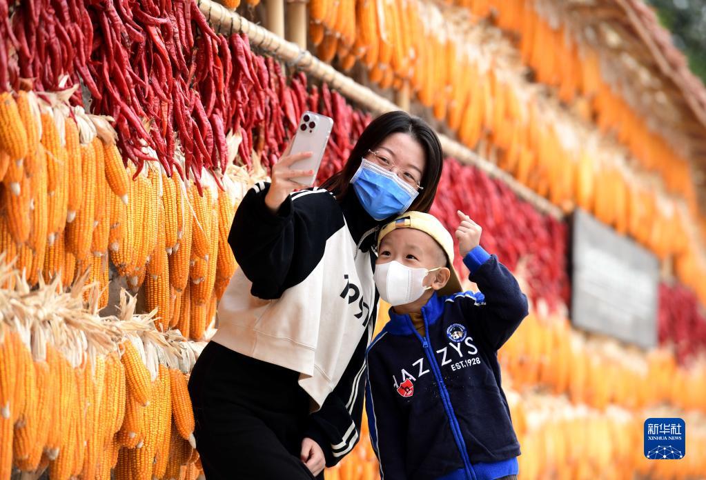 10月5日,在河北省石家莊市鹿泉區(qū)段莊村,游客與曬秋美景合影。