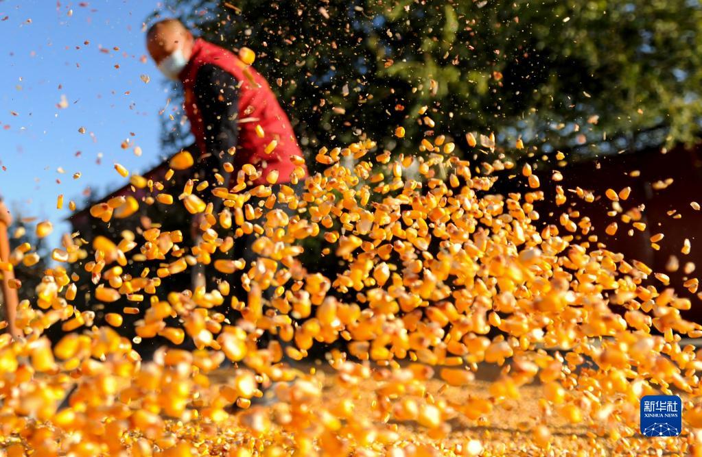 新疆塔城市也門勒鄉闊克加依達克村村民搶抓有利天氣晾曬玉米(10月5日攝)。