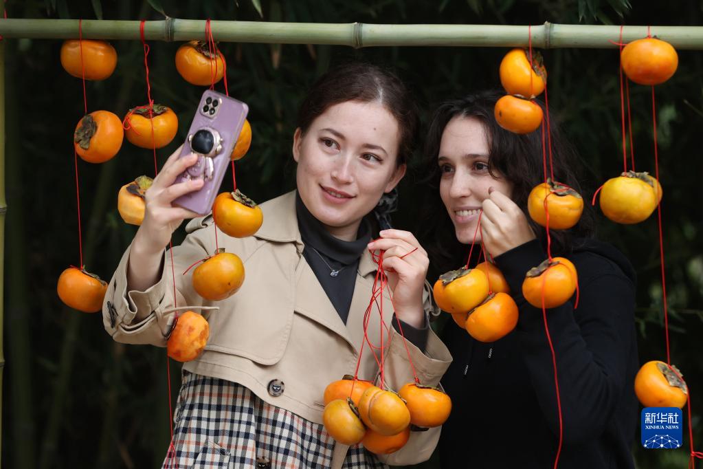 10月5日,游客在浙江省湖州市德清縣康乾街道新琪村體驗柿餅穿線吊掛。