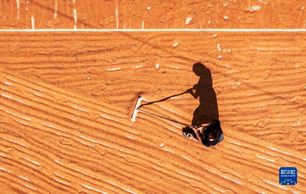 10月5日,村民在貴州省黔西市甘棠鎮(zhèn)新田社區(qū)晾曬高粱(無人機照片)。