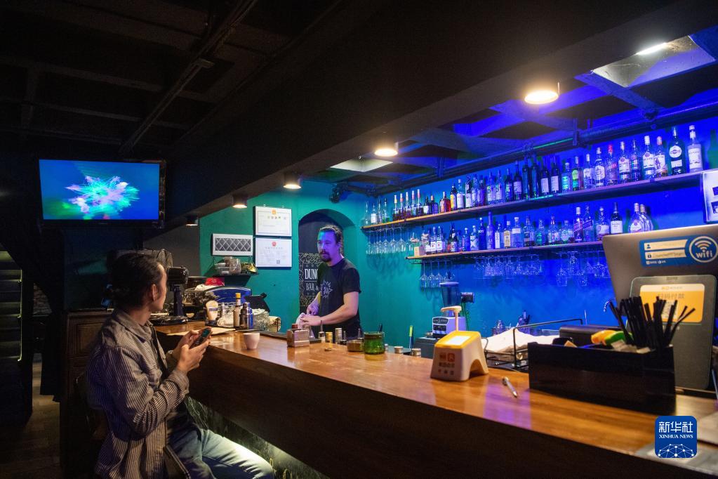 塞爾維亞人邦·斯科特(右)在和中國妻子共同創(chuàng)業(yè)的“地窖”酒吧內(nèi)為客人服務(wù)。該酒吧由工業(yè)遺址的地下室改造而成(2022年9月23日攝)。