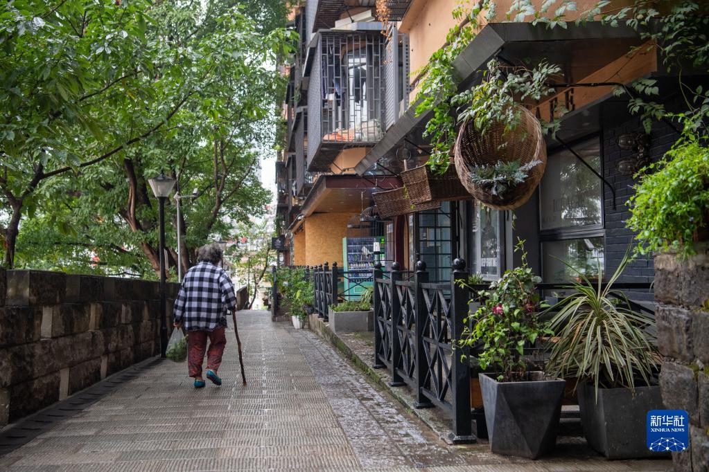 一名市民經(jīng)過重慶市渝中區(qū)戴家巷。該處老社區(qū)經(jīng)過修繕改造,成為深受年輕人和游客喜愛的臨江“咖啡街”(2022年9月24日攝)。