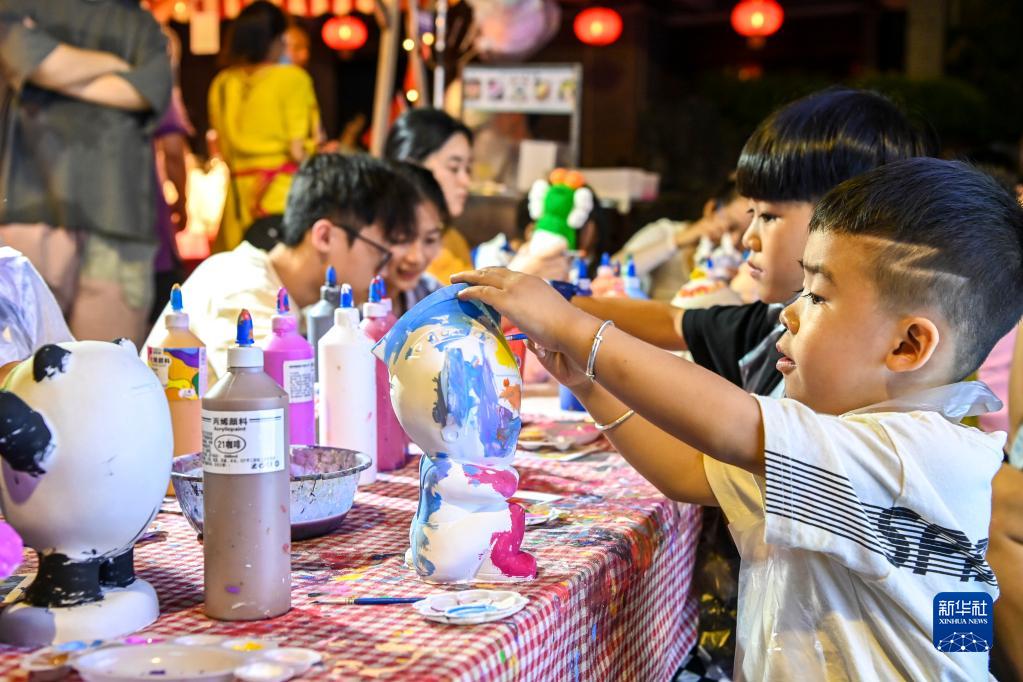 10月1日,在南寧一處夜市,小朋友為石膏模型上色。