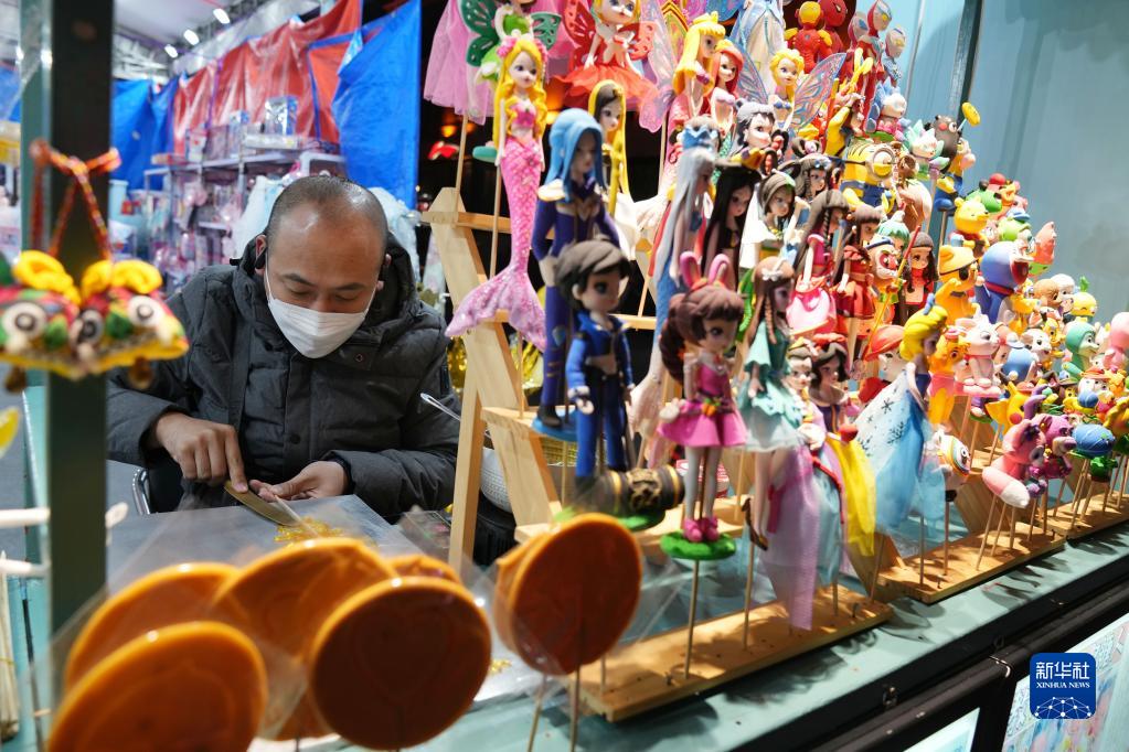 10月5日,在哈爾濱中央大街,民俗藝人在制作糖人。