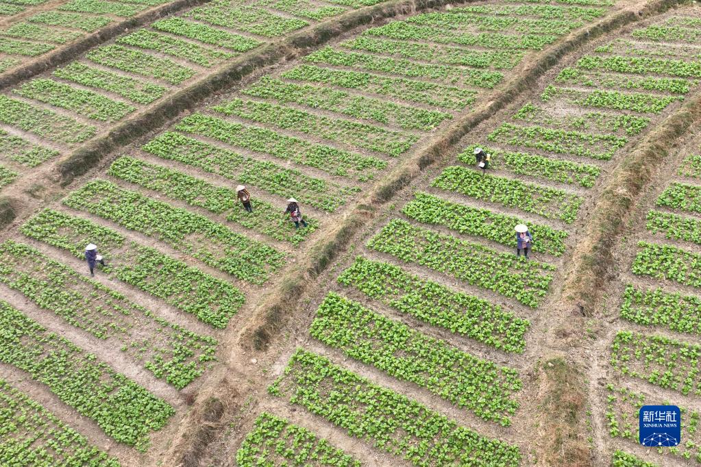 10月6日,村民在貴州省黔東南苗族侗族自治州岑鞏縣水尾鎮(zhèn)大樹林村蔬菜基地勞作(無人機照片)。