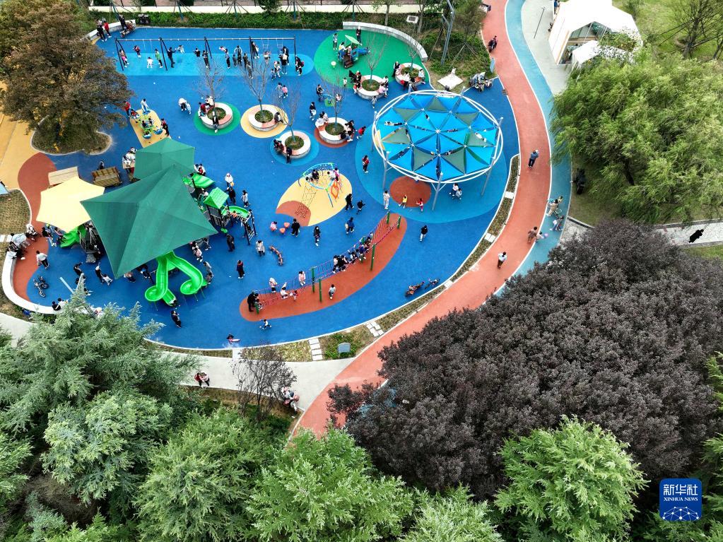 10月6日,青少年在山東青島西海岸新區(qū)雙珠公園游樂場玩耍(無人機照片)。