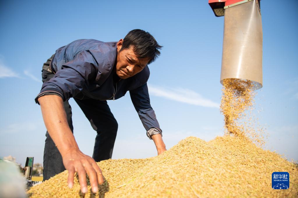 10月20日,在湖南省常德市鼎城區(qū)謝家鋪鎮(zhèn),農(nóng)民整理運(yùn)輸車上的稻谷。