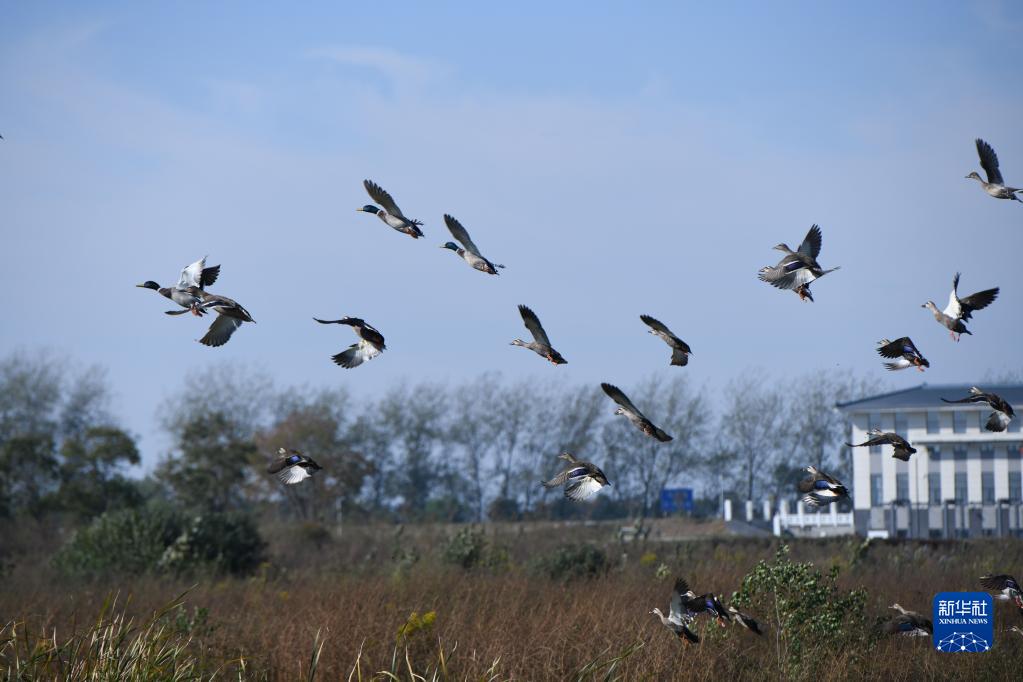10月20日,鳥兒在十八聯圩濕地上空飛舞。