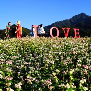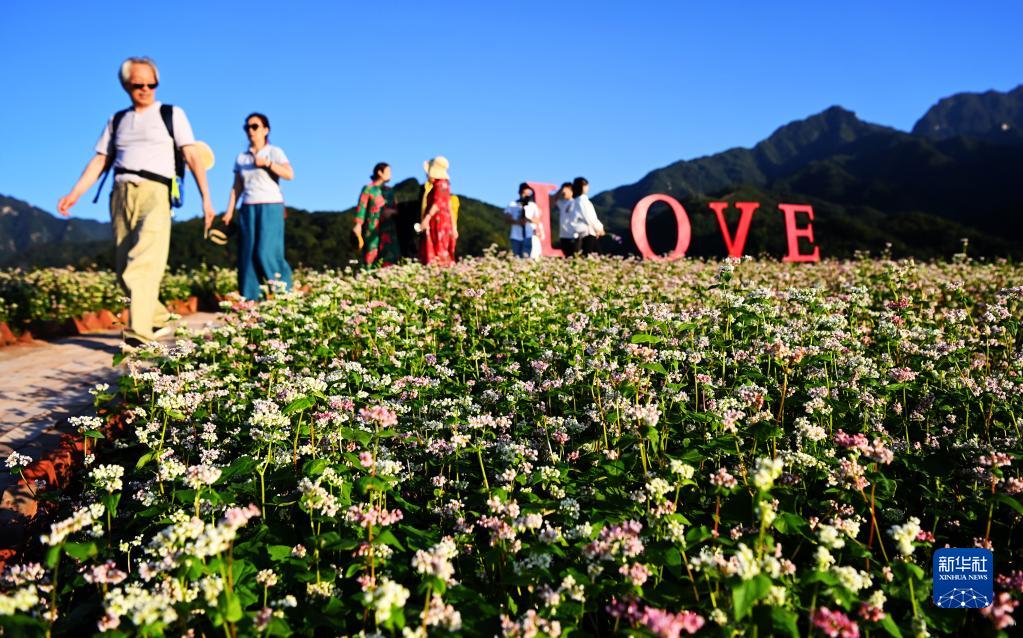 游人在西安市藍(lán)田縣九間房鎮(zhèn)峪口村蕎麥花海農(nóng)業(yè)景區(qū)游覽(9月28日攝)。