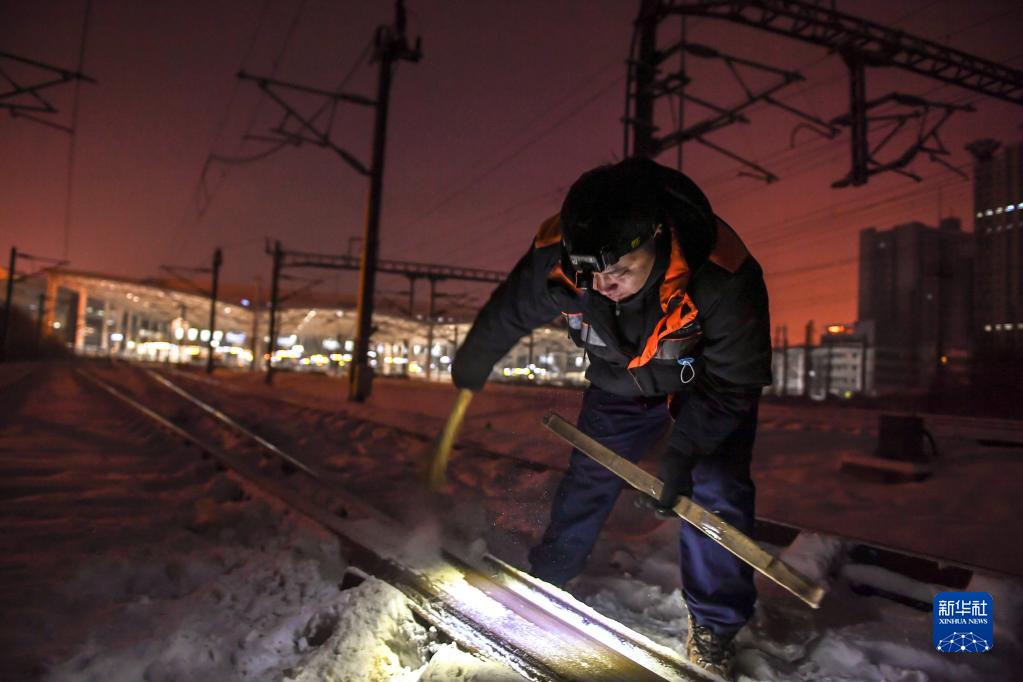11月13日,在長春火車站,中國鐵路沈陽局集團(tuán)有限公司長春高鐵基礎(chǔ)設(shè)施段工作人員清理鐵軌縫隙內(nèi)的冰雪。