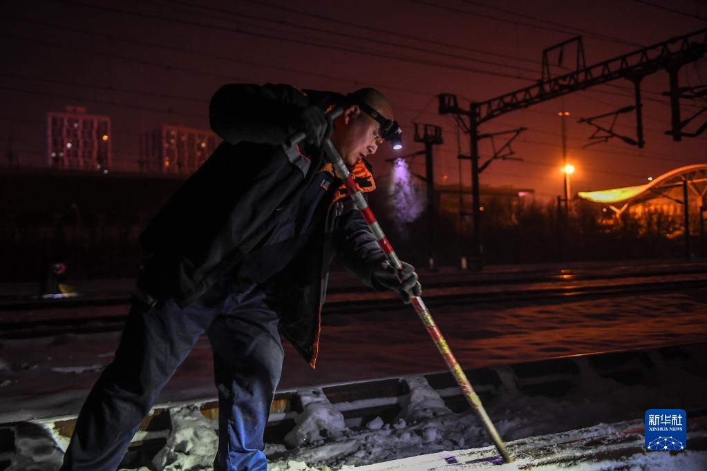 新華全媒+丨冬夜除冰雪 列車保安全