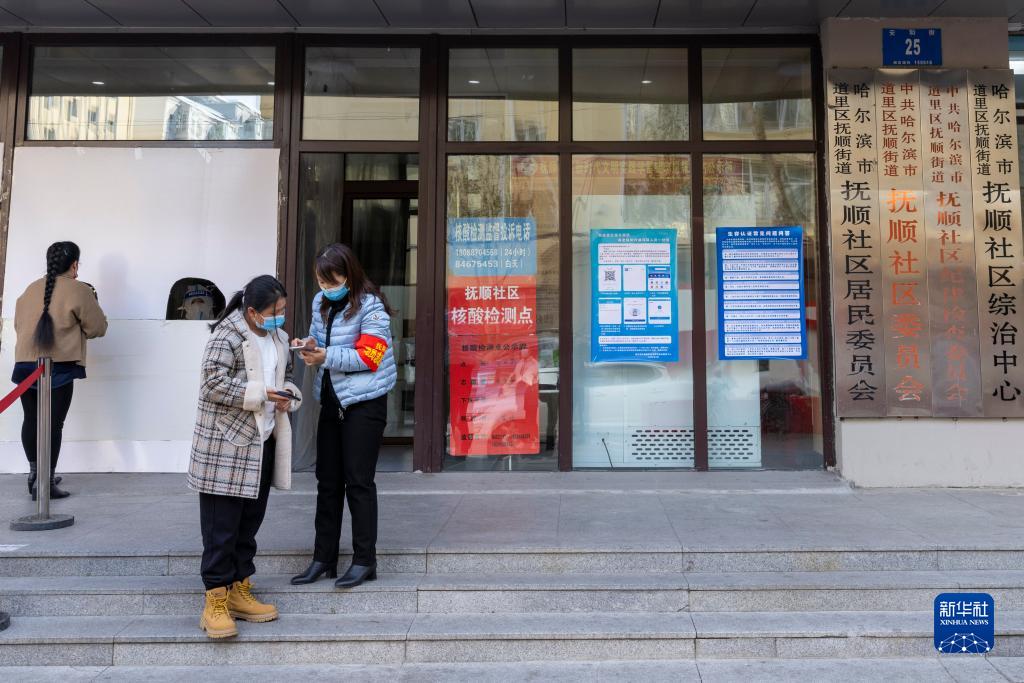 11月9日,在哈爾濱市撫順社區辦公區,郝麗影(右)幫助居民注冊信息。