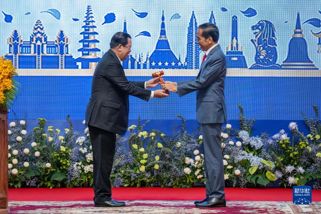 11月13日,在柬埔寨首都金邊,柬埔寨首相洪森(左)將東盟輪值主席木槌移交給2023年東盟輪值主席國印度尼西亞總統佐科。