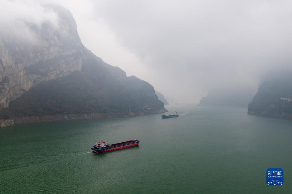 初冬時節,湖北省宜昌市秭歸縣西陵峽上空云霧繚繞,船行江上,宛如一幅水墨畫卷。