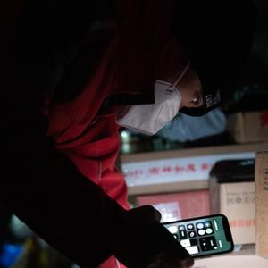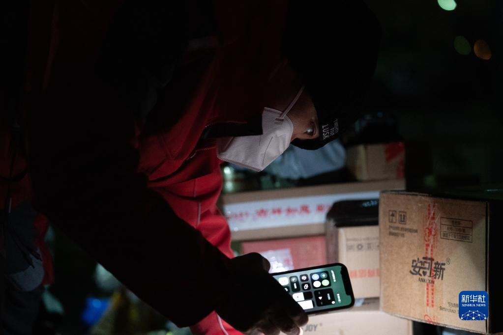 在北京市大興區新源時代小區,快遞小哥高興興打開手機手電筒查看包裹信息(12月15日攝)。