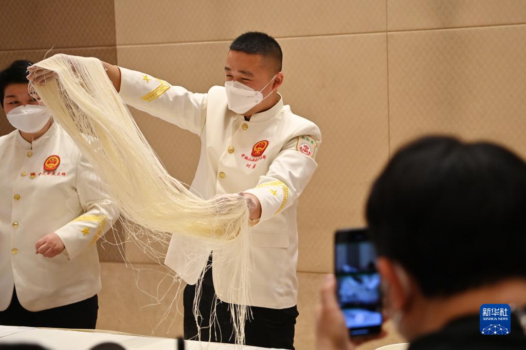 12月16日,廚師在2022中國非遺面食大會現場表演面食制作技藝。