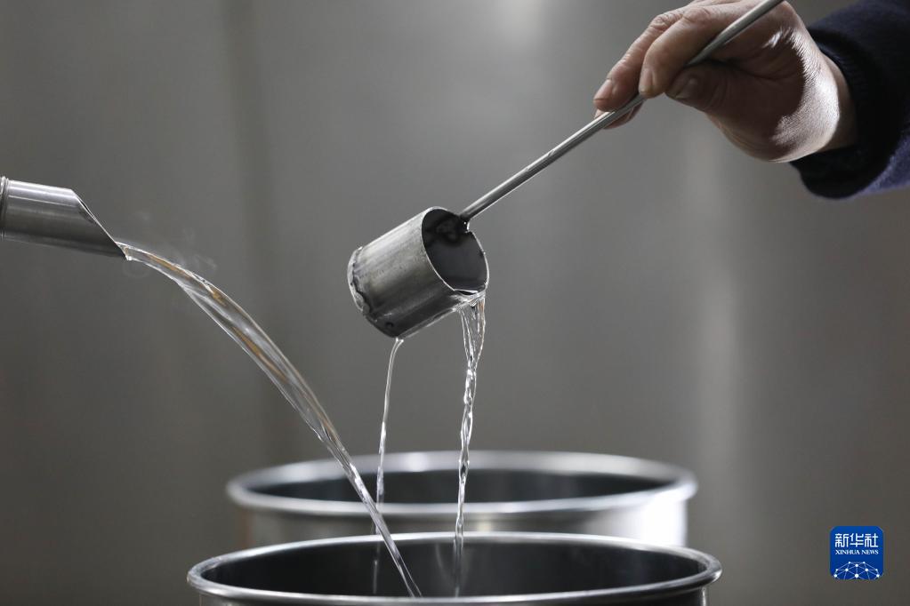 12月16日,工人在寶豐縣邢莊村一釀酒車間查看白酒品質(zhì)。
