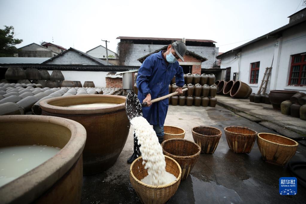 12月16日,在浙江省東陽市馬宅鎮屠梁村一酒廠,釀酒師傅將浸泡后的糯米撈出。