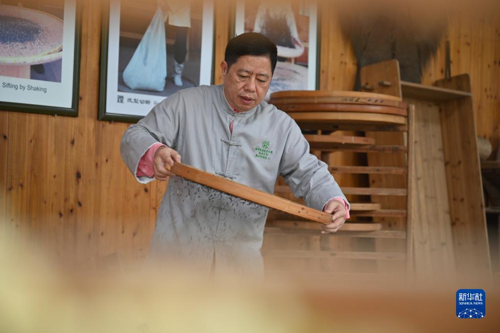12月16日,在福州茉莉花茶制茶工坊,福州茉莉花茶傳統窨制工藝大師傅天甫進行制茶的第一道工序“平”。“平”就是用多孔竹制品篩茶,將毛茶分出大小、粗細。