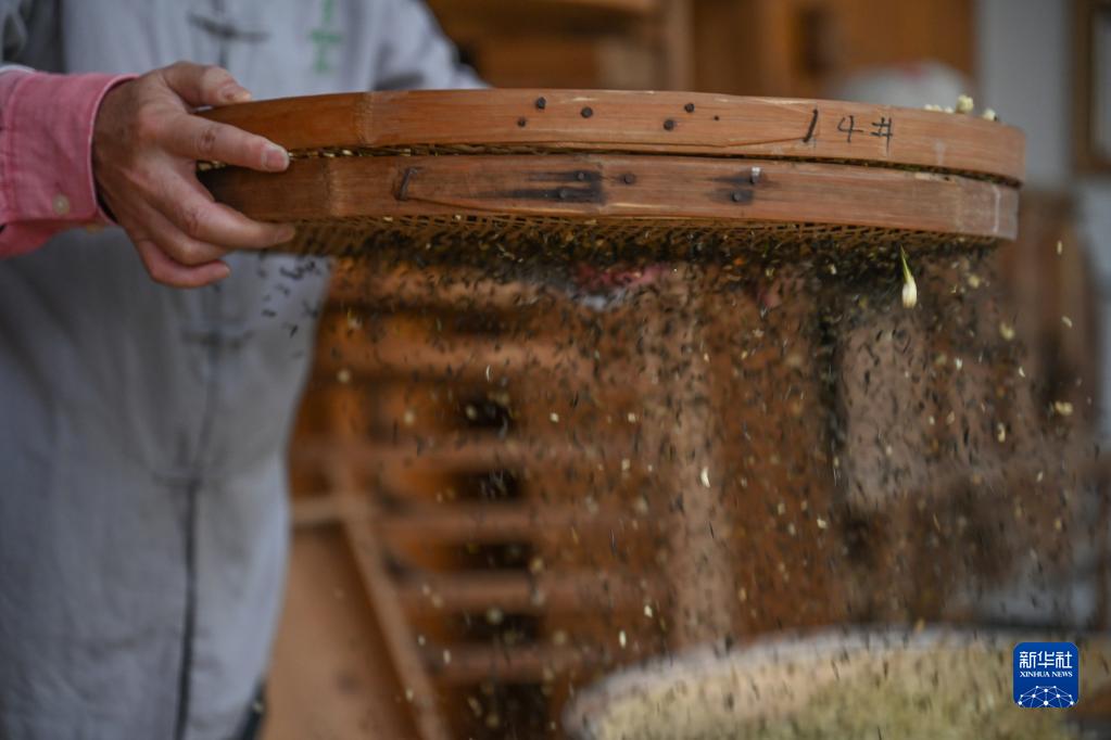 12月16日,在福州茉莉花茶制茶工坊,福州茉莉花茶傳統(tǒng)窨制工藝大師傅天甫在篩茶。篩茶是把需要重復(fù)窨次的茉莉花茶中的花和茶葉分離。