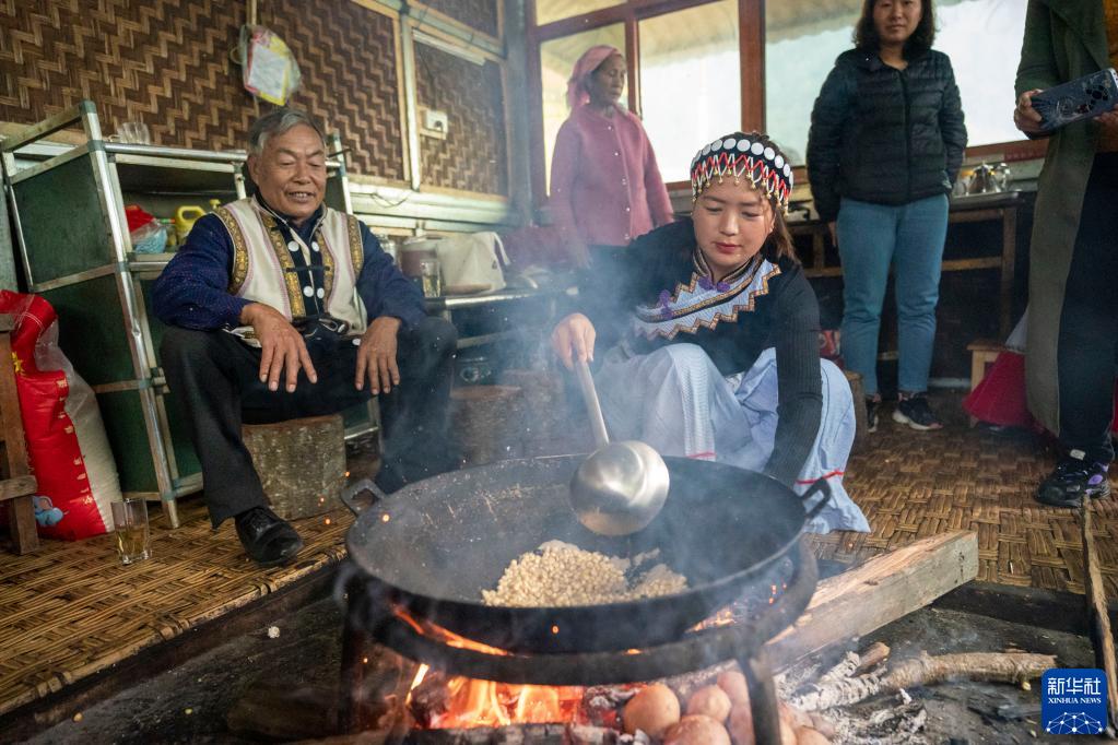 2月22日,云南省福貢縣施底村秘境灣景點(diǎn)的村民向游客展示傈僳族傳統(tǒng)方式制作爆米花。