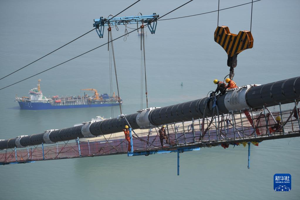 2月22日,工人在深中通道伶仃洋大橋海上施工貓道及主纜上開展作業(yè)。